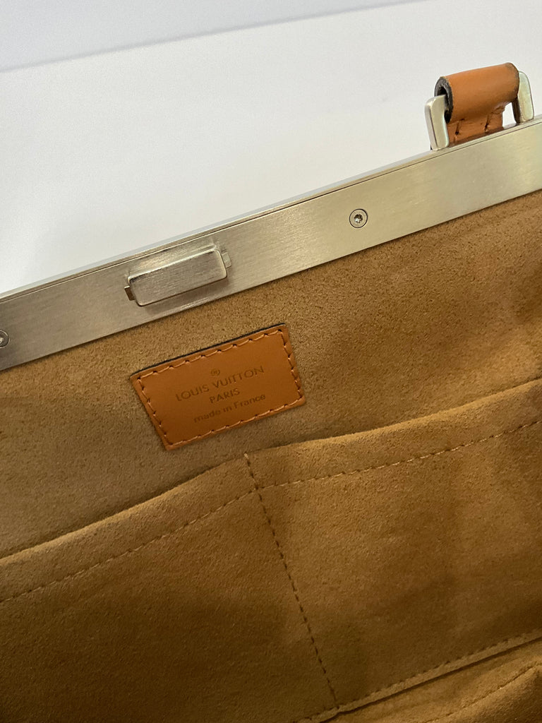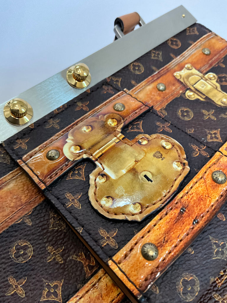 The Crown frame design draws inspiration from vintage Louis Vuitton trunk at the Maroquin City bag from the 1930s. It incorporates a Trompe l’oeil effect to mimic the appearance of a classic trunk.