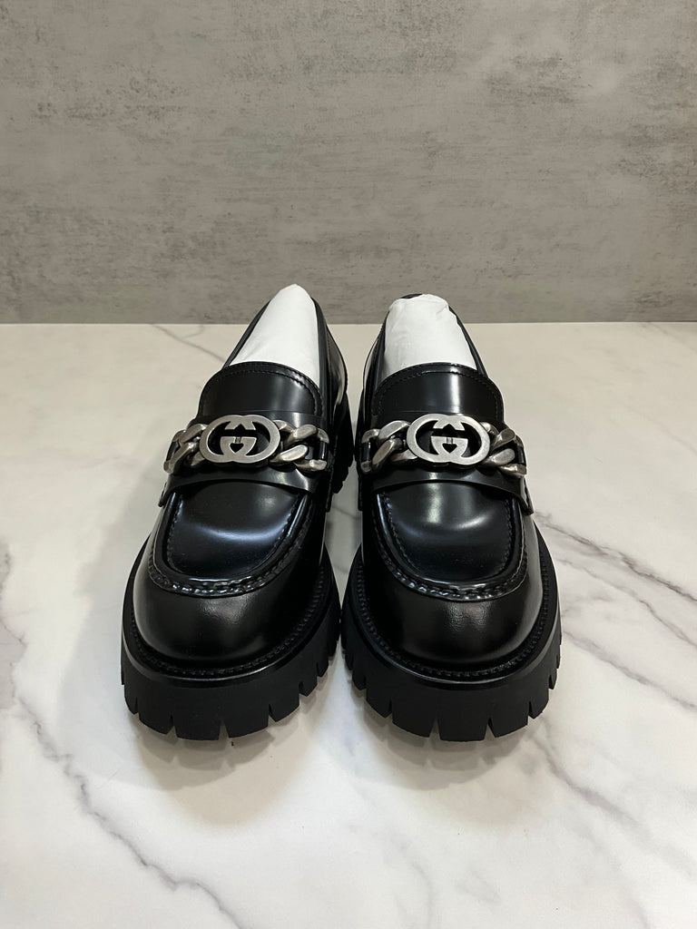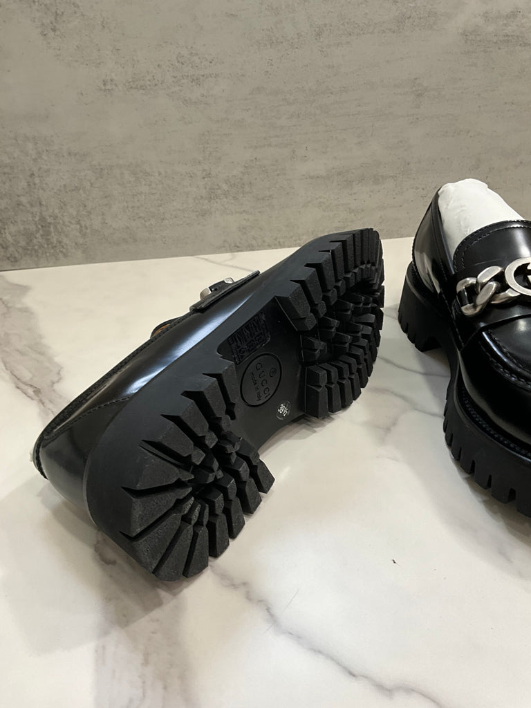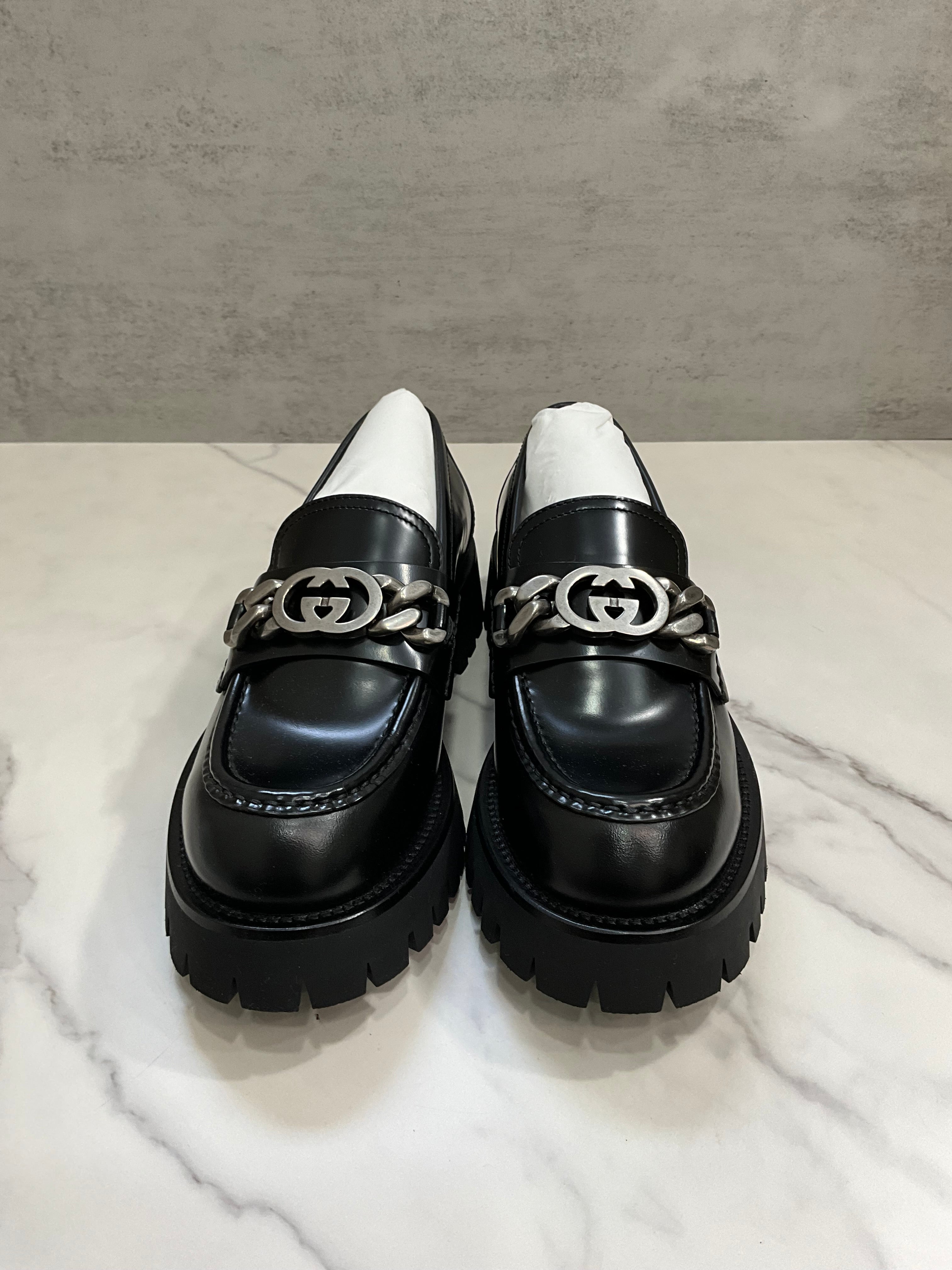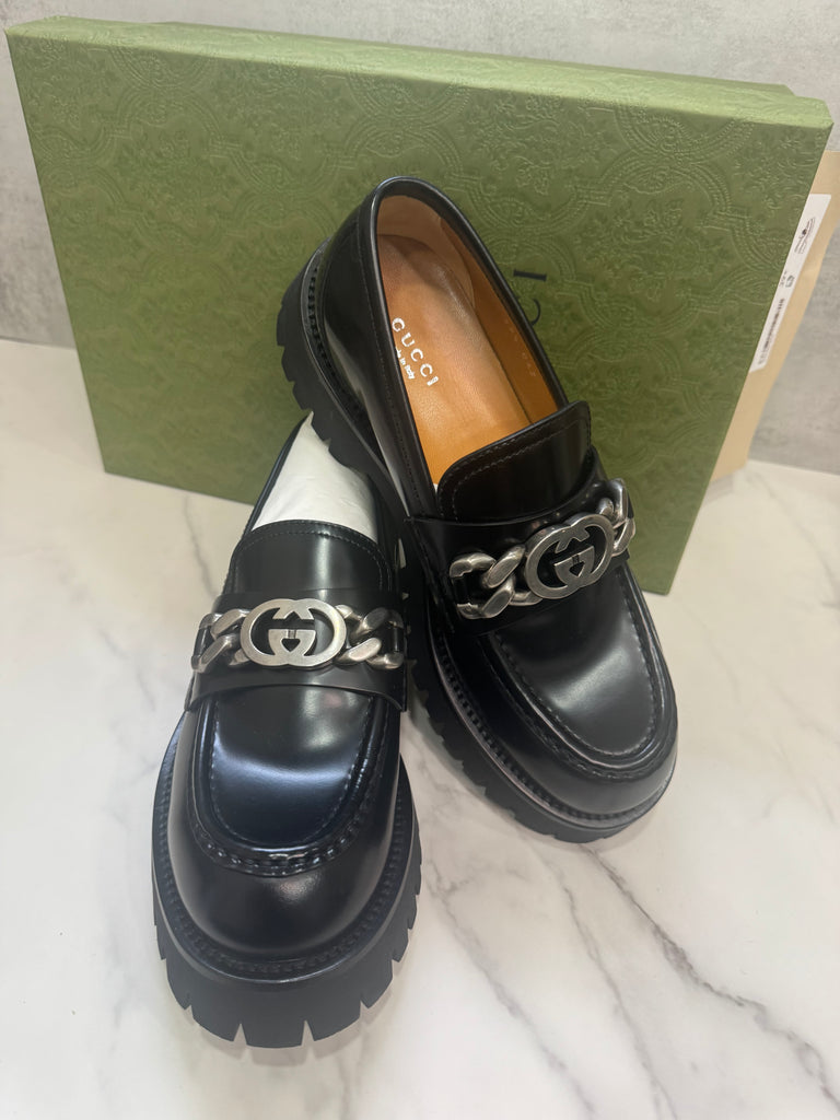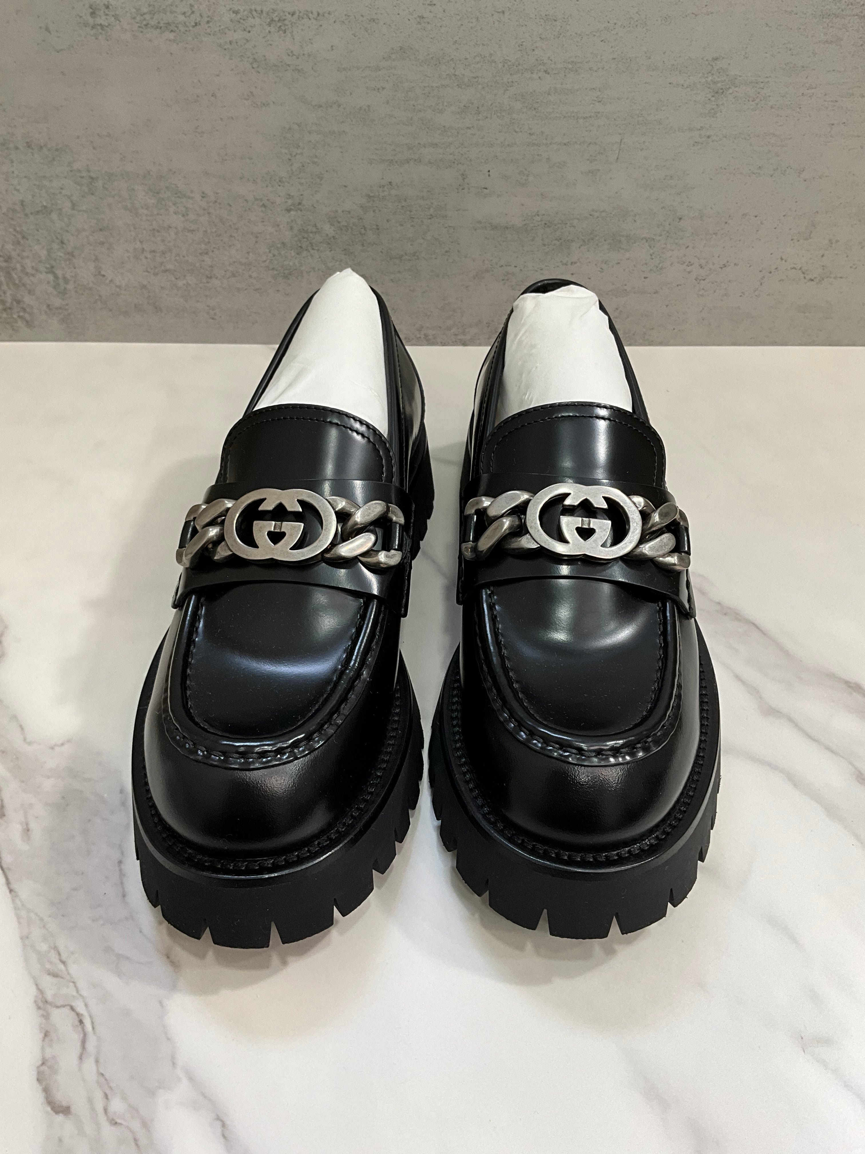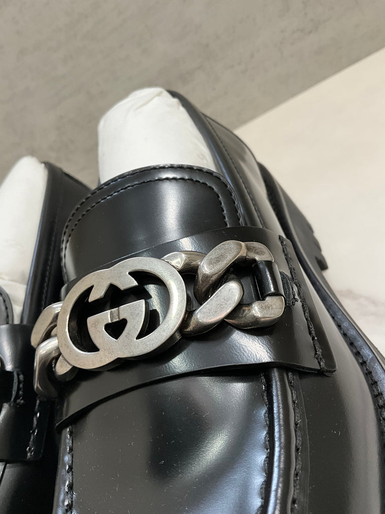 GUCCI JEANNE CORDOVAN LUX INTERLOCKING GG CHAIN LOAFER 39.5 Black LUG SOLE