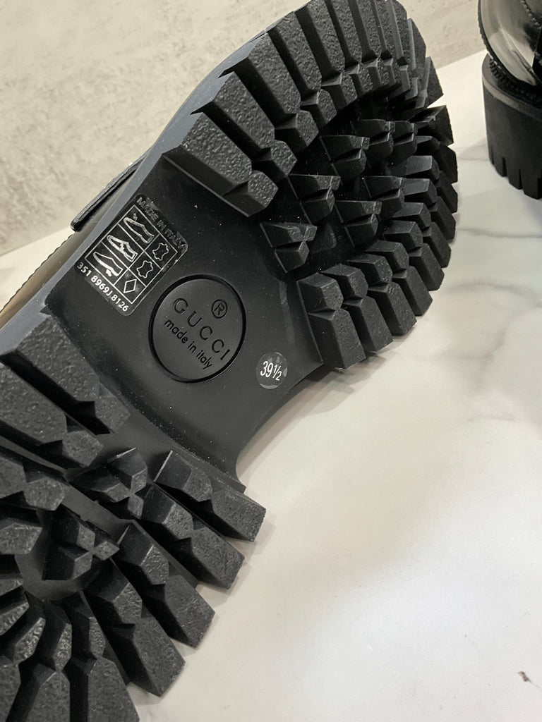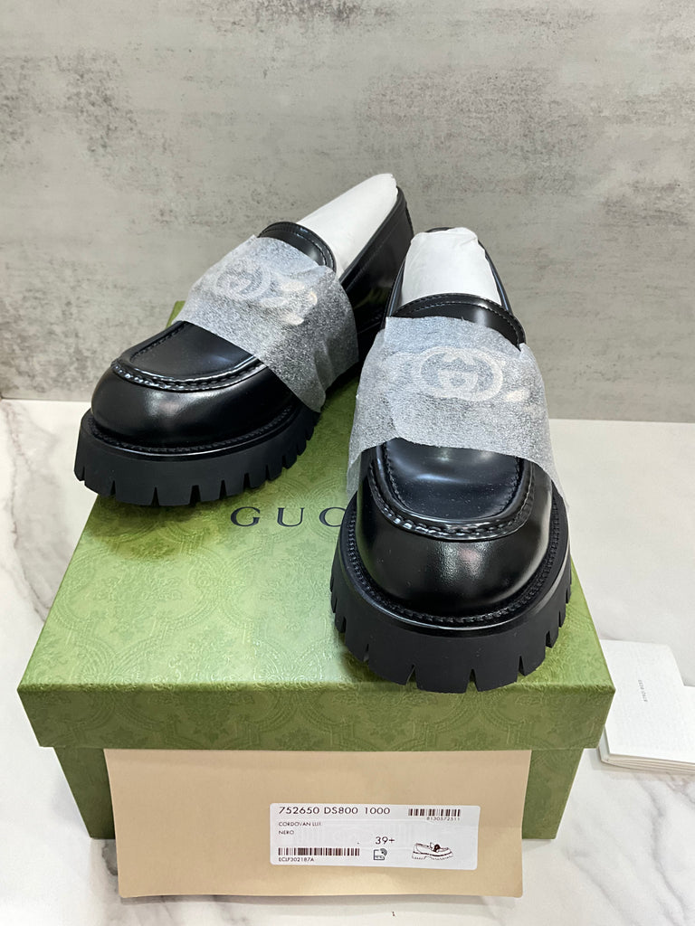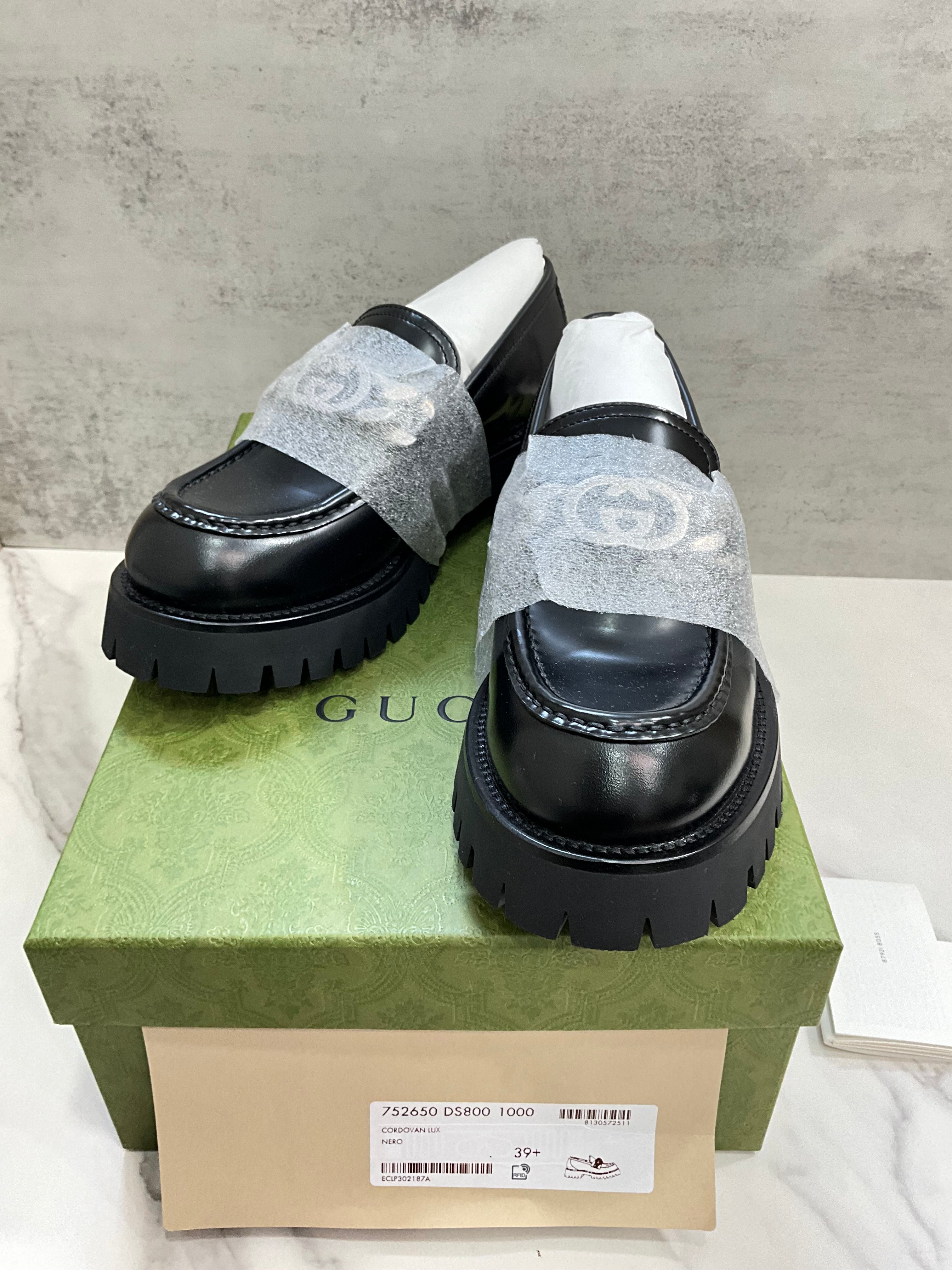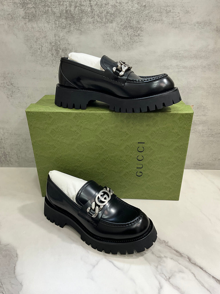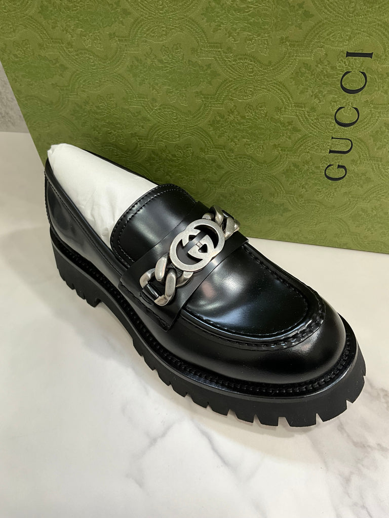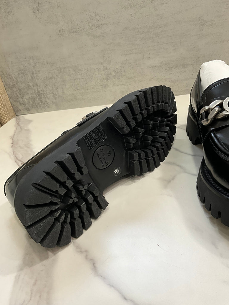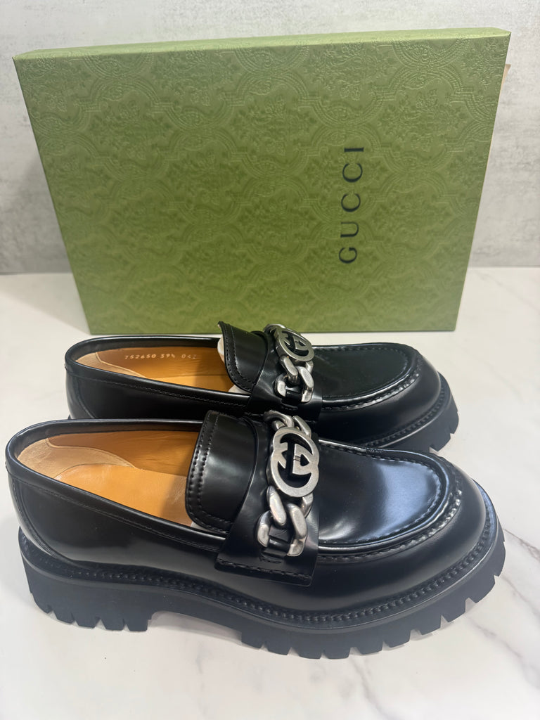 GUCCI JEANNE CORDOVAN LUX INTERLOCKING GG CHAIN LOAFER 39.5 Black LUG SOLE